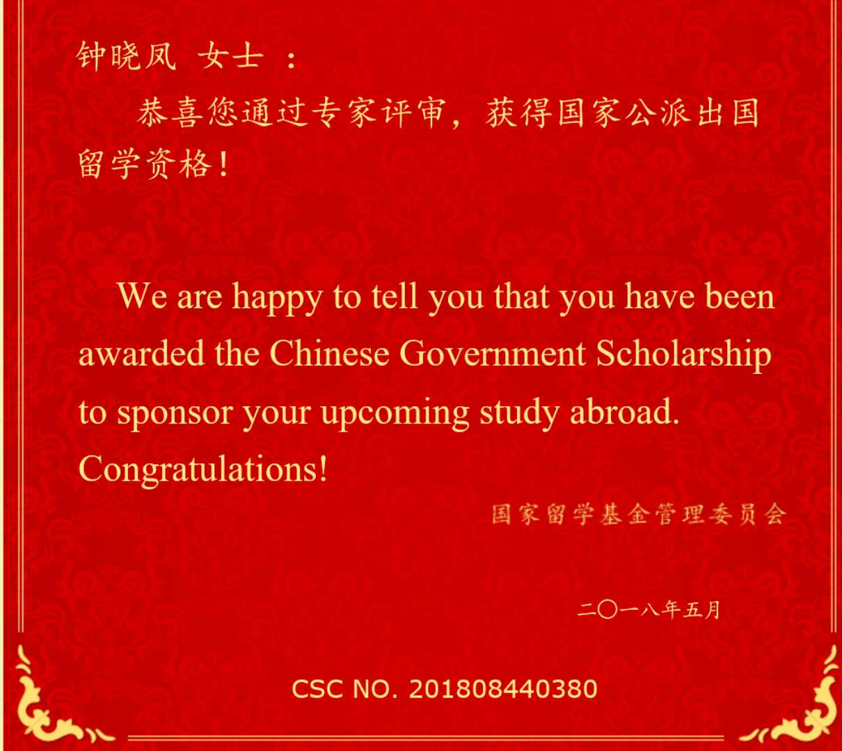 根据《2018年国家公派硕士研究生项目录取结果确定》的通知,我院2016级国际贸易学专业硕士研究生钟晓凤获得国家公派出国留学资格,由国家留学基金委员会全额资助。