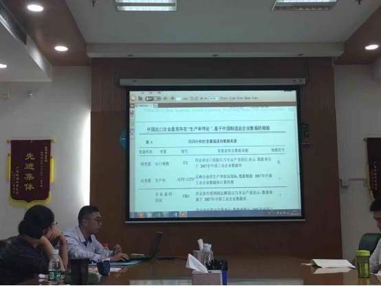 经济组由两位同学进行汇报,2016级研究生刘剑平,汇报题目是《广东省出口企业“生产率悖论”的检验--基于集聚效应的角度》;2017级研究生张蔼容同学,汇报题目为《广东农民收入影响因素研究》。两位同学分别从现实角度论述了选题的意义,并认真听取了康老师、安老师和李老师给予的指导意见,并就实证研究问题与两位老师积极交流,与会师生就各种问题进行了良好互动。