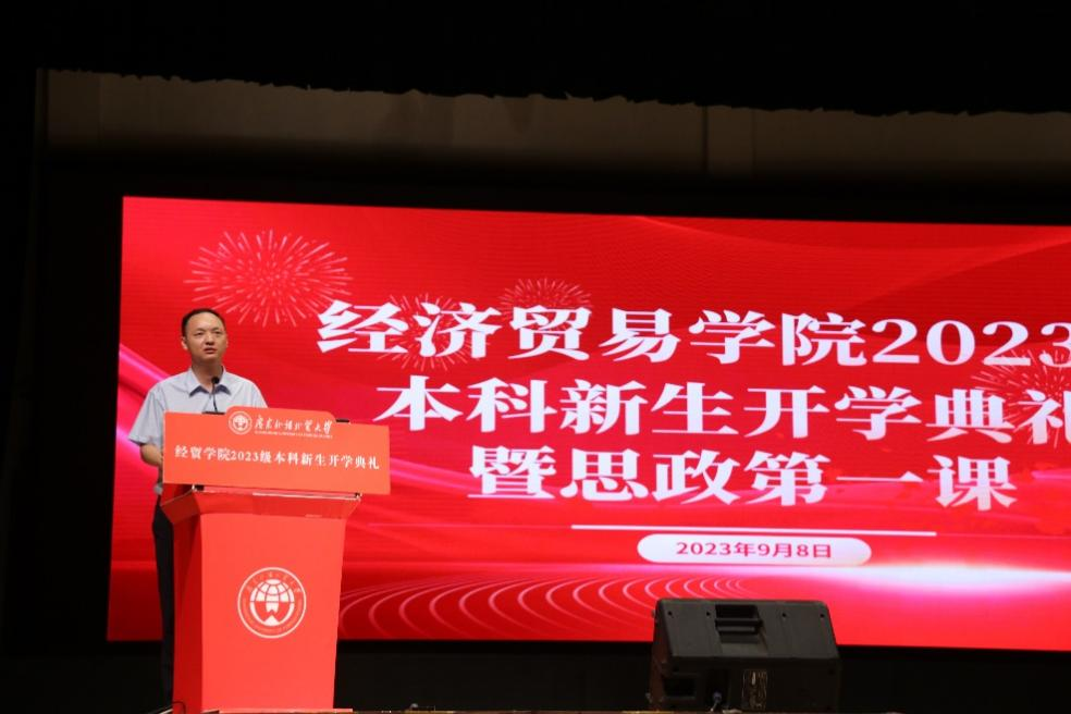 经济贸易学院2023级本科新生开学典礼暨思政第一课于9月8日上午在南校区大会堂隆重举行。学院院长孙楚仁、学院副院长张志明、学院副院长官华平、学院党委副书记陈思、教师代表徐明、全体辅导员、老生代表陈冠雲、新生代表黄煜皓及全体2023本科新生等出席开学典礼。典礼由学院党委副书记陈思主持。