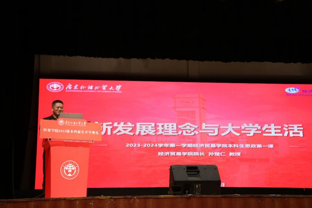 议程最后,由孙楚仁院长以“新发展理念与大学生活”为题,为经贸学院的各位新生上大学的思政第一课。孙楚仁院长生动地将创新、协调、绿色、开放、发展五大理念与大学生活进行融合,勉励各位同学认真学习,并将所学用于服务、奉献社会,成为要做一个对国家、对社会有用的人。
