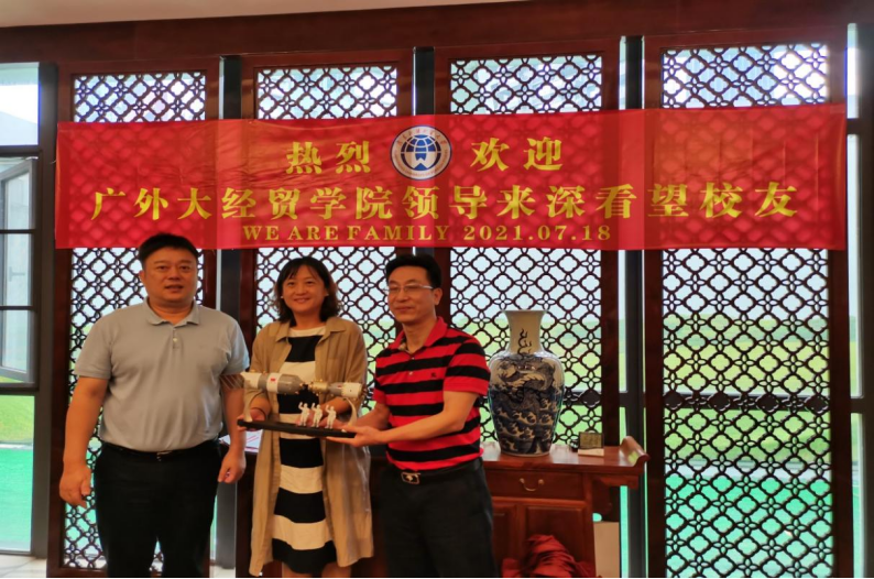 座谈会上,理事会名誉会长蓝斌男代表深圳经贸校友热烈欢迎学院领导的到访,感谢学校和学院对经贸校友的关心。蓝斌男指出,深圳校友会一直秉承“校园、家园、乐园”的理念,建设家文化提升幸福感。他强调,一直以来经贸人不负国家和学校重托,在各项各业中发挥作用,足迹遍布全球,谨遵师长教导,团结一心、相互帮助、相互合作。深圳经贸校友代表还为到访的母校领导老师送上了纪念品和鲜花。