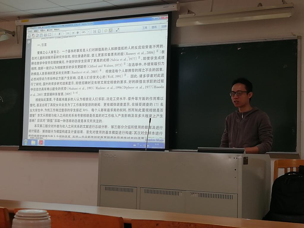 12月30日上午在南校区教学楼G208,陈川博士给经济系大二、大三学生开了一场题为“经济系学术讲座:如何阅读经济文献?——以《颜值与收入》一文为例”的讲座。